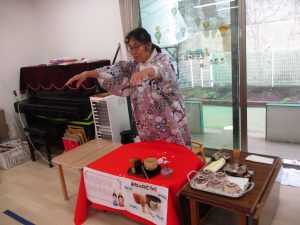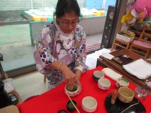 上手にお茶碗を回し、のみおわったらお茶碗の拝見をしたり、とお茶会の雰囲気を味わいました。