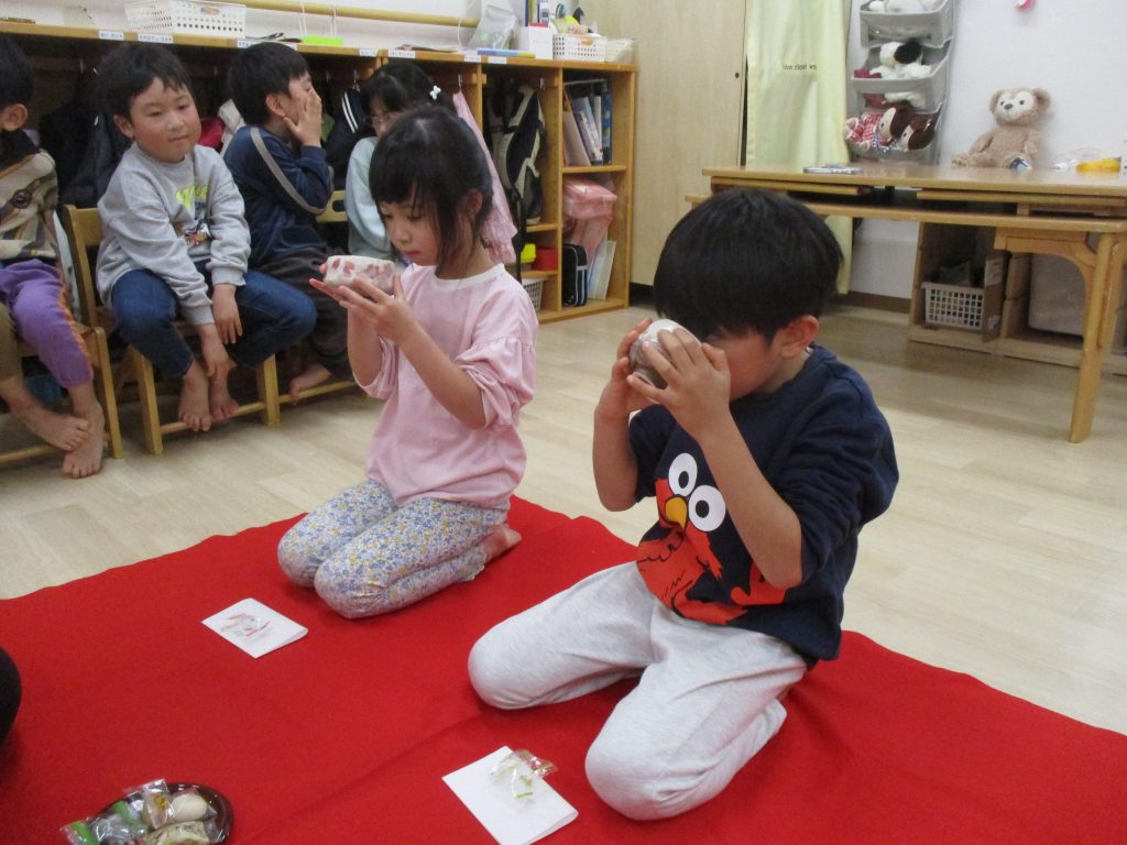 「ちょっとにがーい」「おいしー」。「おまんじゅうおいしい!」とニコニコ顔でお話をしていました。