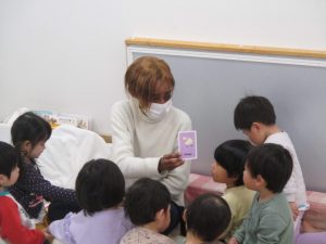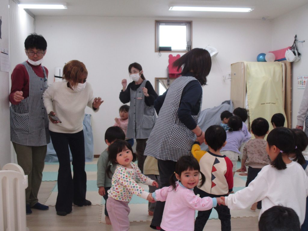うさぎ・ぱんだ・きりん組さんはカードを見たり、音楽にあわせて踊ったり歩いたりと